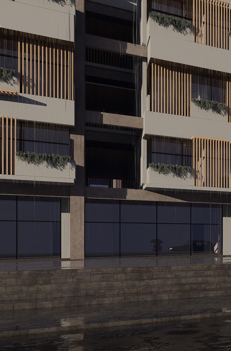 En términos formales, el diseño adopta estrategias arquitectónicas que dialogan con el clima cálido y húmedo de la región. Se incorporan tramados que funcionan como elementos de protección solar, reduciendo la incidencia directa del sol y manteniendo un confort térmico adecuado dentro de los espacios habitables. Estas soluciones pasivas no solo mejoran la eficiencia energética, sino que también generan una estética distintiva que refleja la identidad costera de Manta. Además, el esqueleto estructural del edificio se deja expuesto, integrando lo constructivo como parte del lenguaje visual, resaltando la honestidad material y la solidez del diseño.
