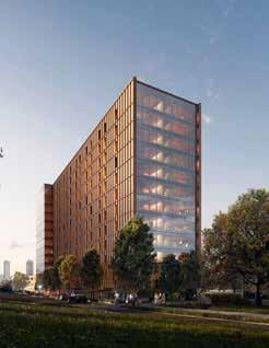 The mass timber and structural steel hybrid building with a fully prefabricated envelope is configured as two rectangular wings positioned at 90 degrees. The CLT point-supported structure is comprised of 11 storeys of cross-laminated timber (CLT) floors supported by steel hollow structural section (HSS) columns, on a concrete podium. The building in-