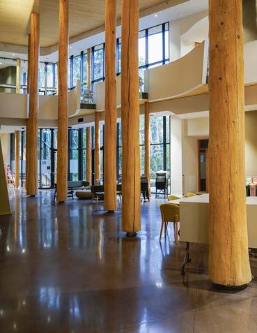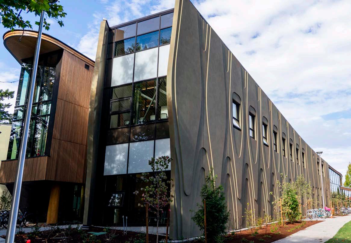 ing, creating a cohesive flow and integrated environment. There are public lecture theatres, faculty offices, classrooms, meeting spaces, a creation space, a sky classroom, a 150-seat lecture hall, an Elder’s room, and an outdoor learning classroom. The exposed timber structure and sloping roof mimics the height of the surrounding forest, connecting the building to its natural context while minimizing environmental impact.