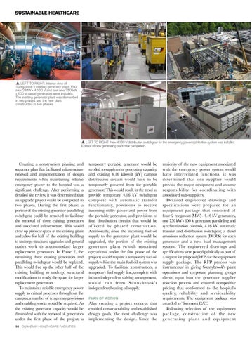 Creating a construction phasing and sequence plan that facilitated infrastructure renewal and implementation of design requirements, while maintaining reliable emergency power to the hospital was a significant challenge. After performing a detailed site review, it was determined that an upgrade project could be completed in two phases. During the first phase, a portion of the existing generator paralleling switchgear could be removed to facilitate the removal of three existing generators and associated infrastructure. This would clear up physical space in the existing plant and allow for half of the existing building to undergo structural upgrades and general trades work to accommodate larger replacement generators. In Phase 2, the remaining three existing generators and paralleling switchgear would be replaced. This would free up the other half of the existing building to undergo structural modifications to ready the space for larger replacement generators. To maintain a reliable emergency power supply to critical processes throughout the campus, a number of temporary provisions and enabling works would be required. As the existing generator capacity would be diminished with the removal of generators under the first phase of the project, a 16 CANADIAN HEALTHCARE FACILITIES