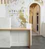 Within the salon area are large-scale porcelain tiles, again with a marble appearance reminiscent of Calacutta, chosen for their moisture-resistance and ease of cleanability.