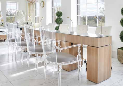 Soft white walls are juxtaposed with pale grey mouldings and gold archways; a modern twist on traditional form. Tucked away in dedicated zones for added privacy, treatment rooms are compact and cozy, designed with millwork solutions to eliminate wasted space. Traditionally overlooked areas like hallways are an experience of their own through the use of textured, barrel-vaulted ceilings and intricate panel moulded walls. Palatial light fixtures and elegant, streamlined furniture from the spa’s previous location in Orillia, Ont., were incorporated into the design.