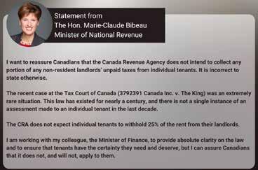So, what is protecting tenants from needing to withhold and remit this tax? A history of non-enforcement on the part of CRA and Canada’s Minister of National Revenue Marie-Claude Bibeau. In a statement made on X (formally Twitter) Minister Bebeau stated that the recent case “was an extremely rare situation” and that “there is not a single instance of an assessment made to an individual tenant in the last decade”. Minister Bibeau went on to say, “I am working with my colleague, the Minister of Finance, to provide absolute clarity on the law”.