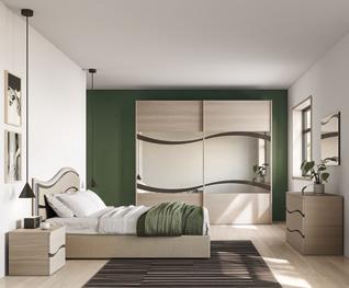 4. Duncan camera composta da: armadio scorrevole con specchi L 271 P 63 H 247 cm, letto matrimoniale con contenitore e led, comò, 2 comodini e specchio, in finitura tortora. / 81,41 € AL MESE
