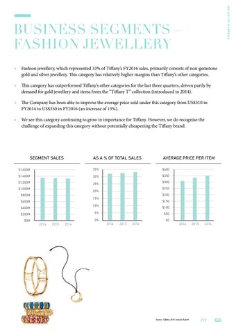 Fashion jewellery, which represented 33% of Tiffany’s FY2016 sales, primarily consists of non-gemstone gold and silver jewellery. This category has relatively higher margins than Tiffany’s other categories.