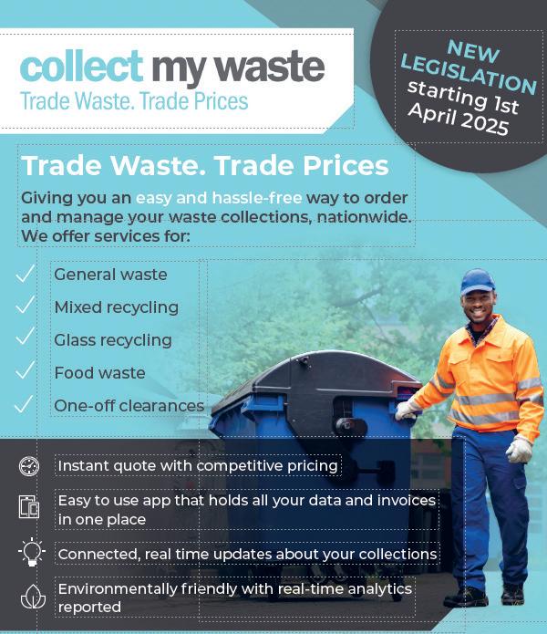 Collect My Waste offers Booker catering customers trade waste management at exclusive trade prices, giving you an easy and hassle-free way to order and manage your waste collections. Services include general waste, mixed recycling, glass recycling, food waste and one-off clearances. You’ll get an instant quote with competitive pricing, an easy-touse app that holds all your data and invoices in one place, and connected, real-time updates about your collections.