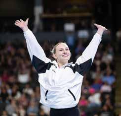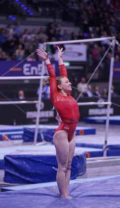 Her ascent hasn’t been easy. She’s broken her back twice, after slowdeveloping stress fractures. She dislocated her elbow competing in Italy in 2022, an injury that took six months to get her back on bars and nine months to return to full strength. Yet she kept going, rebuilding each time with quiet determination. “It’s definitely a mental game,” she says. “You have to love it enough to fight your way back.”