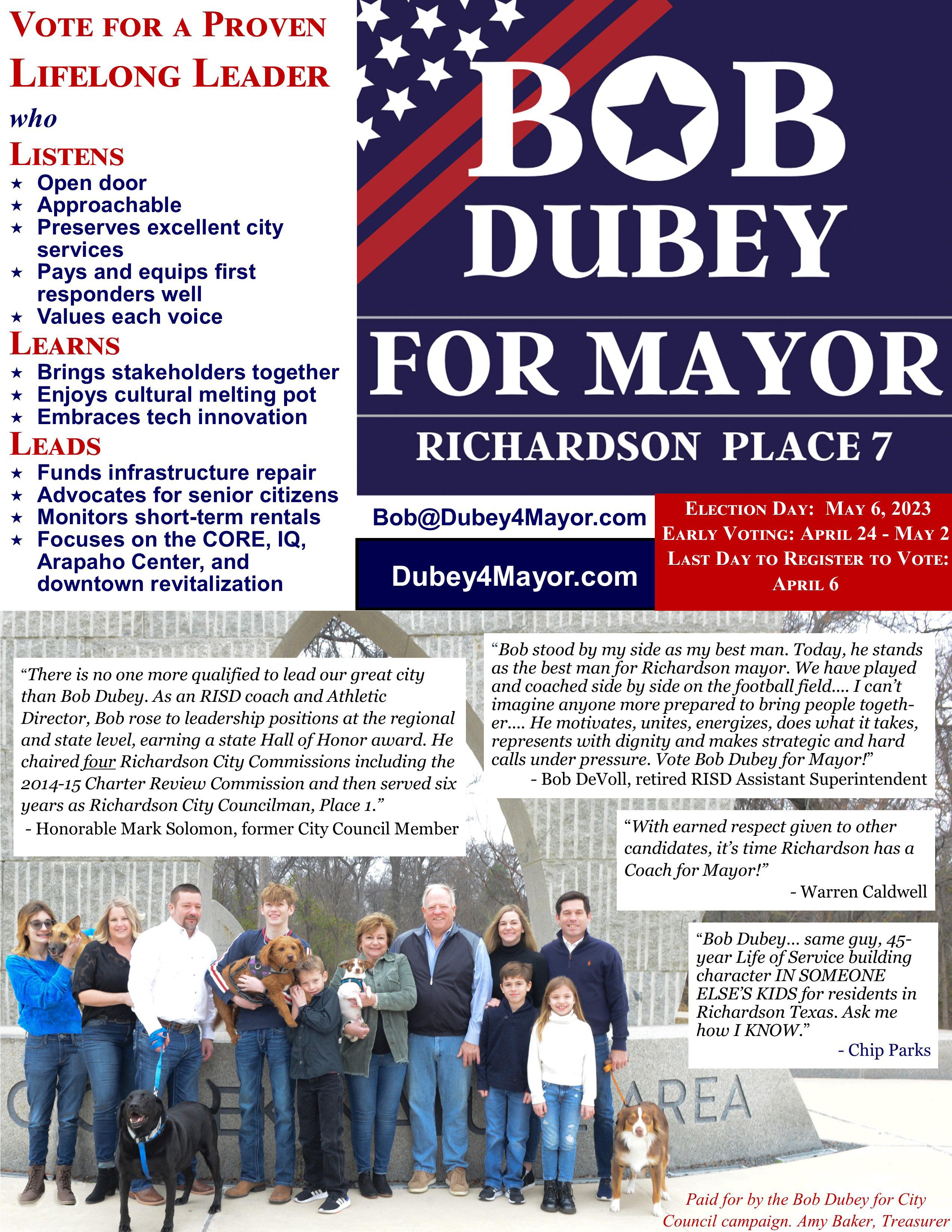 A chance to vote on a variety of items which directly impact Richardson, including electing a new Mayor, voting for City Council members, RISD Board of Trustees and the Bond Election for City Hall replacement.