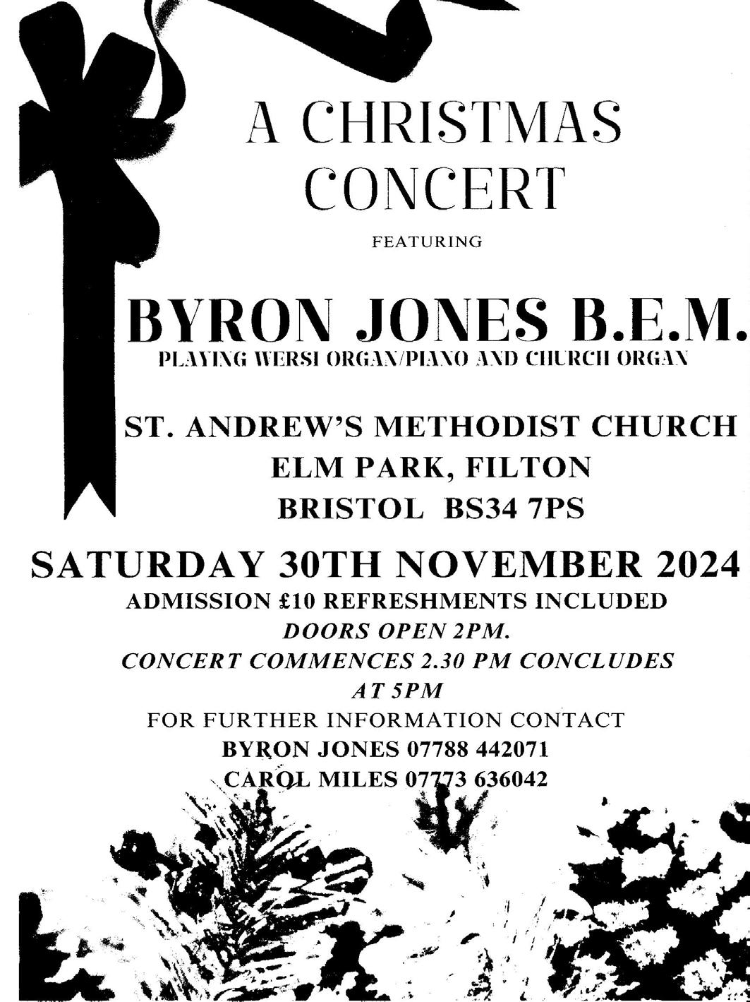 Playing Welsh Piano and Church Organ Saturday 30th November at St Andrews Methodist Church, Elm Park Filton. Doors open 2PM. Concert 2.30PM - 5PM. Admission £10, refreshments included For more information contact: Byron Jones 07788442071 or Carol Miles 07773636042