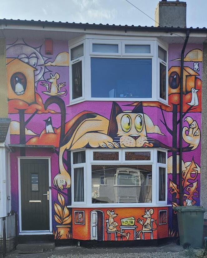The vibrant work, which features dining mice and a towering feline figure, was painted on the front of a house in Filton by artist Shaun Sepr.
