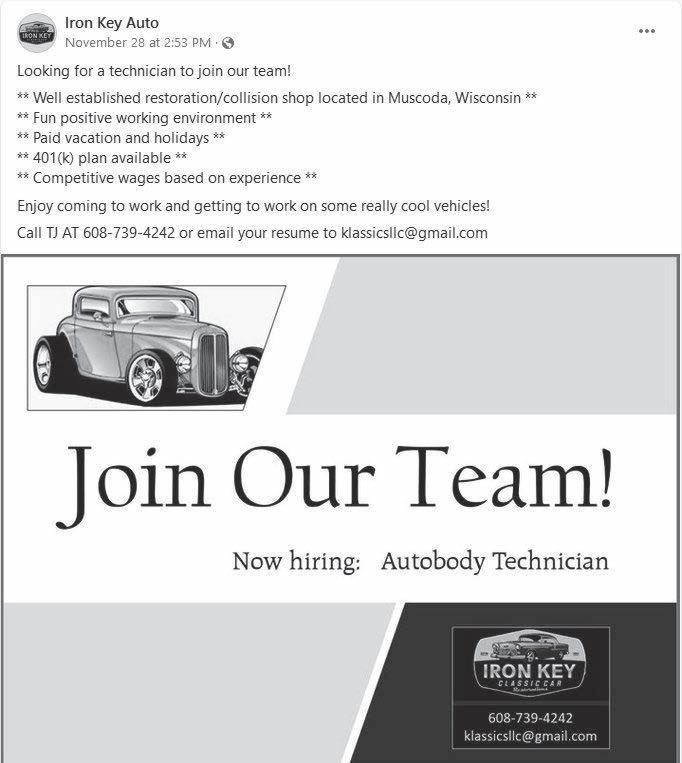 adno=318 68 PART TIME LAB TECHNICIAN Apply in person. Free Choice Enterprises, Ltd 10055 County Rd K, Lancaster, Wi (608) 723-7977 adno=319079 Looking for a technician to join our team! • Well established restoration/collision shop located in Muscoda, Wisconsin • Fun positive working environment • Paid vacation and holidays • 401(k) plan available • Competitive wages based on experience Enjoy coming to work and getting to work on some really cool vehicles! Call TJ AT 608-739-4242 or email your resume to klassicsllc@gmail.com Now Hiring: Autobody Technician adno=318962 IS HIRING FULL AND PART TIME POSITIONS ON ALL SHIFTS $2.00 PER HOUR NIGHT SHIFT BONUS COMPETITIVE WAGES AND BENEFITS Excellent Retirement Program Medical Insurance & HRA Life Insurance Paid Vacation Paid Holidays Paid Personal Days Paid Sick Leave Referral Bonuses NO EXPERIENCE NECESSARY We Will Train You CALL 608-739-3171 OR APPLY DIRECTLY AT… Scot Industries, 810 East Nebraska Street Muscoda, WI 53573 Scot Industries is a 70 year old family owned manufacturing company looking for Regional Truck Drivers to deliver our products. Earn $60,000.00 or more annually Benefits… NEW TRUCKS Excellent Profit Sharing Plan Medical