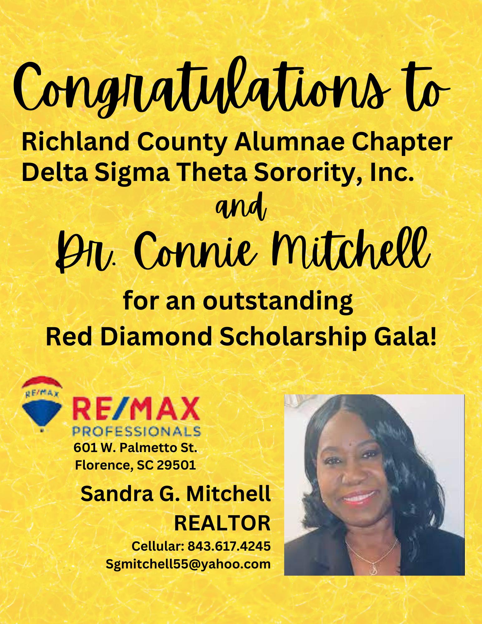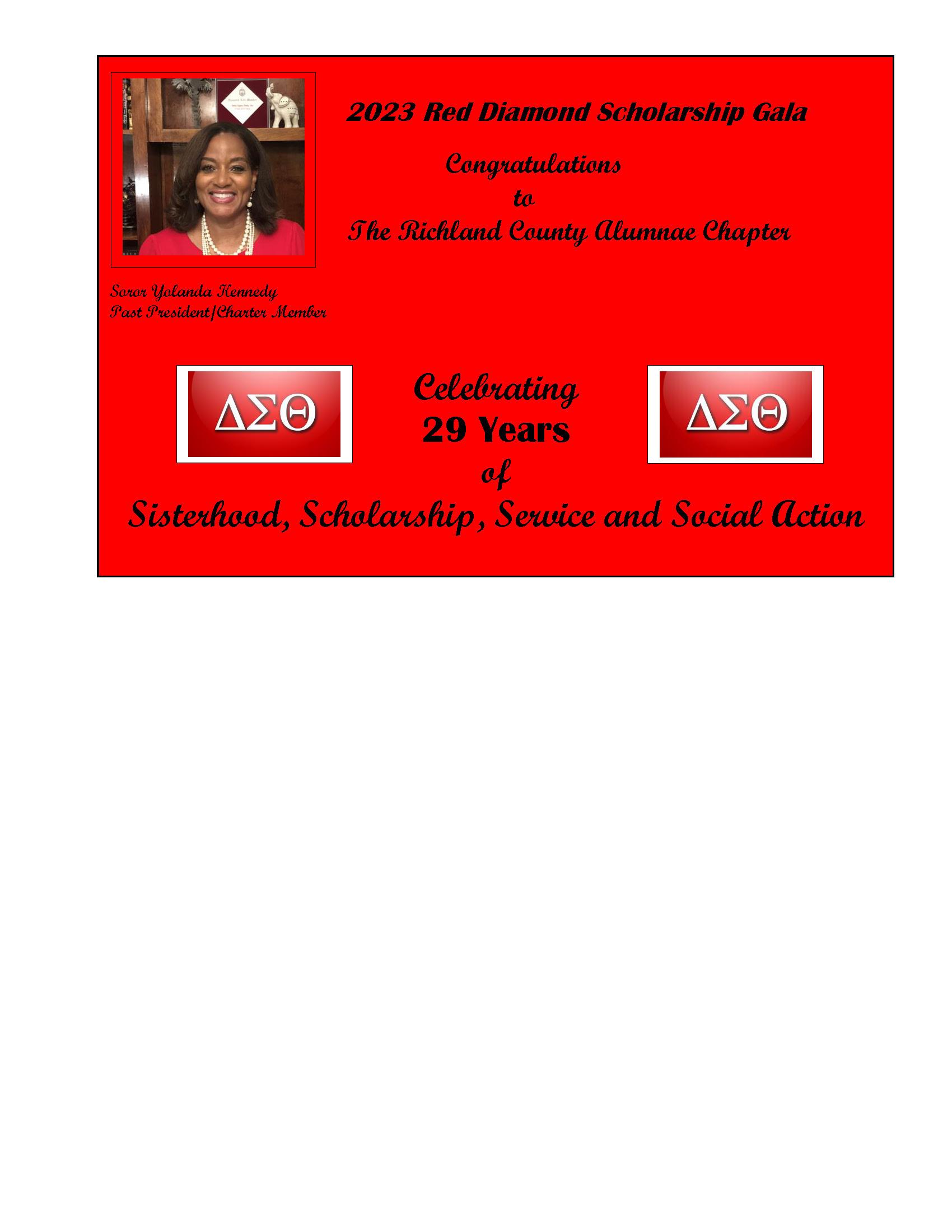 Welcome to the 23rd Annual Red Diamond Scholarship Gala! Richland County Alumnae (RCA) celebrates 29 years of Sisterhood, Scholarship, Service and Social Action, and Fortitude Foundation (FF) celebrates 13 years of Transforming Lives and Impacting Communities. We are excited to host you this evening and express our appreciation for your continued support. As a result of your contributions and sponsorships for this year, we are able to award scholarships to deserving youth and fund our community outreach programs in the communities of Richland, Lexington, Fairfield, and Newberry counties.