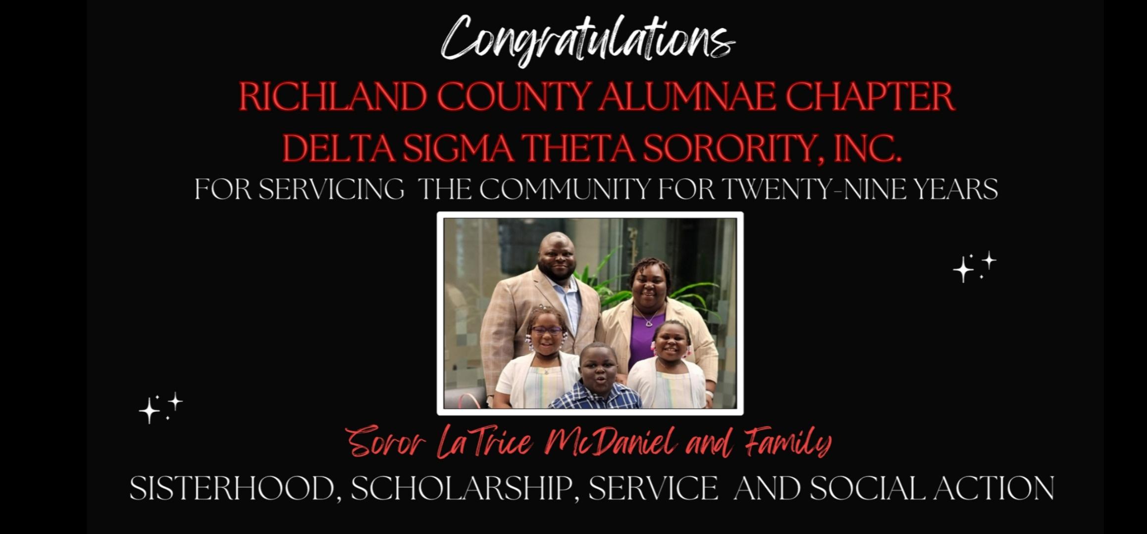 The Richland County Alumnae Chapter of Delta Sigma Theta, Incorporated is an organization of college educated women who seek to uphold the high ideals of our sorority while proudly accepting opportunities to be of service to their community. The chapter has grown from 44 charter members in 1994 to over 350 members today, but its mission remains the same; RCA is “A Sisterhood Answering the Call to Serve: Transforming Lives and Impacting Communities.”