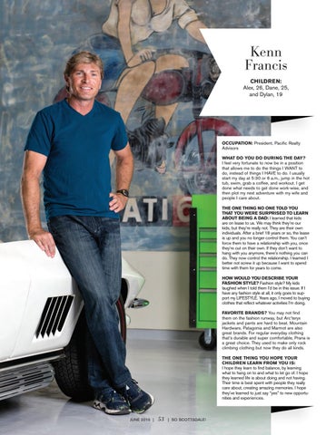 OCCUPATION: President, Pacific Realty Advisors WHAT DO YOU DO DURING THE DAY? I feel very fortunate to now be in a position that allows me to do the things I WANT to do, instead of things I HAVE to do. I usually start my day at 5:30 or 6 a.m., jump in the hot tub, swim, grab a coffee, and workout. I get done what needs to get done work-wise, and then plot my next adventure with my wife and people I care about. THE ONE THING NO ONE TOLD YOU THAT YOU WERE SURPRISED TO LEARN ABOUT BEING A DAD: I learned that kids are on lease to us. We may think they’re our kids, but they’re really not. They are their own individuals. After a brief 18 years or so, the lease is up and you no longer control them. You can’t force them to have a relationship with you, once they’re out on their own. If they don’t want to hang with you anymore, there’s nothing you can do. They now control the relationship. I learned I better not screw it up because I want to spend time with them for years to come. HOW WOULD YOU DESCRIBE YOUR FASHION STYLE? Fashion style? My kids laughed when I told them I’d be in this issue. If I have any fashion style at all, it only goes to support my LIFESTYLE. Years ago, I moved to buying clothes that reflect whatever activities I’m doing. FAVORITE BRANDS? You may not find them on the fashion runway, but Arc’teryx jackets and pants are hard to beat. Mountain Hardware, Patagonia and Marmot are also great brands. For regular everyday clothing that’s durable and super comfortable, Prana is a great choice. They used to make only rock climbing clothing but now they do all kinds. THE ONE THING YOU HOPE YOUR CHILDREN LEARN FROM YOU IS: I hope they learn to find balance, by learning what to hang on to and what to let go of. I hope they learned life is about doing and not having. Their time is best spent with people they really care about, creating amazing memories. I hope they’ve learned to just say “yes” to new opportunities and experiences.