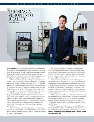 Not only does Whish sell the finished skin care products, but the company also makes the beauty serums, creates bottle decoration, and ships the final product directly to customers. By handling each step involved in the creating and manufacturing process, Jesse and his team at Whish can ensure the best quality products are delivered to customers. Jesse takes a very hands on approach, and manages the entire Whish process start to finish. On a typical day, he interacts with their many employees on everything from the production schedule to social media strategy. In addition, he goes between marketing conference calls, interviewing new employee candidates, working on new product development, fine tuning the marketing calendar, and so much more. “Every day is different, which I really love,” he says. When Jesse is not creating a new beauty product or ensuring only the best quality reaches customers, he spends as much time as he can with his family. As for style, he cannot go without his designer sneakers. Otherwise, he says he does not over think it. “I know what I like when I see it. Or, I go with the style of ‘ask my wife,’” he jokes. “I feel that success isn’t about money or material things. Rather, it is the freedom to have a vision for your business or your life, and have the ability to make that vision a reality,” says Jesse. Contact Jesse Werner of Whish Beauty at 480.219.0864, or visit www.whishbody.com.