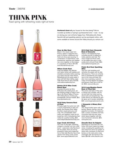 2018 Oak Farm Vineyards Rosé of Grenache There’s a lot happening here, including aromas of grapefruit, melon, jasmine and rose. The wine’s bright and floral notes on the palate give way to crisp acidity and a smooth finish. $24. www.oakfarmvineyards.com. Poizin Brut Rosé Sparkling Wine This brut rosé tantalizes and refreshes the palate with its silky effervescence. There are certainly hints of strawberries and raspberries on the nose and taste, but also more surprising, nuanced notes of honey-dipped red apples and banana cream pie on the finish. $34. www.armida.com. 2018 Long Meadow Ranch Rosé of Pinot Noir The aroma and taste of this wine is intense and complex, with floral and fresh fruit notes such as stone fruits and strawberries. The fruitier flavors are followed by gentle spice, yet it remains refreshing. $25. www.longmeadowranch.com. J Vineyards & Winery Brut Rosé This vibrant bottle opens with raspberries, Rainier cherries, and red grapefruit aromatics. It’s balanced with a creamy mouthfeel and hints of brioche toast and star anise, which dance together with the more fruit-driven elements. $45. www.jwine.com. Cheurlin Rosé de Saignée Operating for more than two centuries, this brand makes low-sugar wines, including this sparkling varietal made from pinot noir grapes. It starts with a bouquet of roses and berries on the nose and is crisp and bright with ripe berries to the taste. $54.99. www.cheurlin.com.