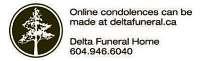 A viewing wil take place for family and friends on Friday, December 2nd, from 11:30 1:30 at the Delta Funeral Home, 5329 Ladner Trunk Road, Delta Bural wil take place, Frday, December 2nd, at 2:30 at Forest Lawn Memoral Park, 3789 Royal Oak Avenue, Burnaby A Memoral Service wil be held on Saturday, December 3rd, at 1:00 at West Rchmond Gospel Hall, 5651 Francs Road, Rchmond folowed by a reception