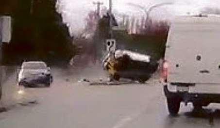 The other vehicle could be seen jumping the median and clipping a road sign, before going out of the shot.