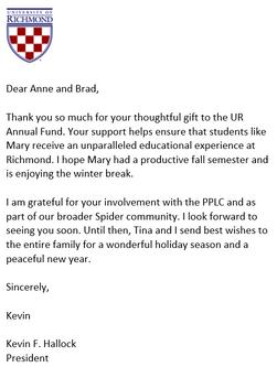 These letters are written by the Assistant Director of Donor Communications, in partnership with more than 20 staff members across Advancement, and acknowledge major gifts with a letter from UR's President ($25,000 or more) or the Vice President for Advancement ($10,000 $24,999), with some exceptions Donor Relations sent approximately: