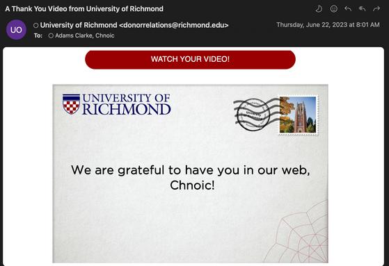 In FY22, the ADDC partnered with University Communications and the Office of Annual Giving to prepare several thank you videos for UR Here Giving Day 2022. Nearly 1,700 Thankviews were sent during Giving Day 2022 and nearly 1,100 during Giving Day 2023.