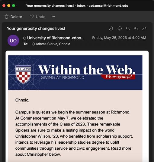 The donor e-newsletters are written and curated by the ADDC on a quarterly basis and emailed to all donors who have given within the past 3 fiscal years Each newsletter includes a campus update from the DDR, as well as links to Giving Spotlight features, photos and/or video(s) from recent events, and other UR news. As part of our efforts to rebrand, the e-news header was updated for a more cohesive appearance.