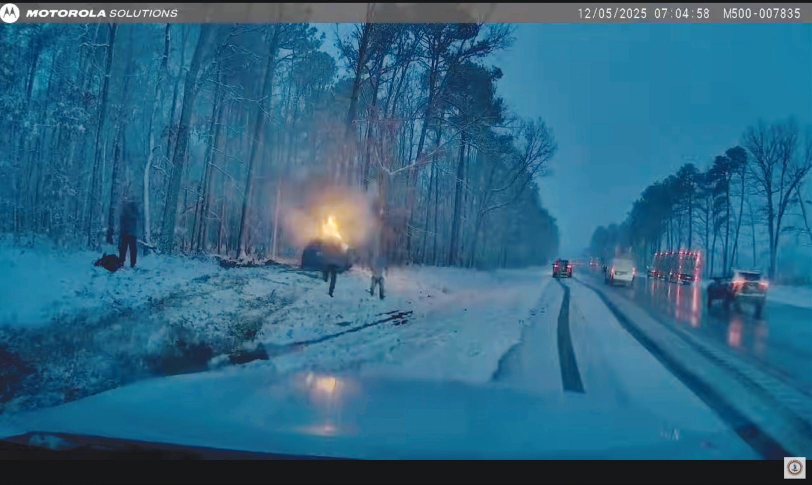 something told me to go northbound. So I was like I’ll just go northbound. And then driving northbound I happened to look over to my left-hand side and saw the Tesla,” Page said. The Tesla’s doors were locked and would not open. Page broke the window, cut the airbag and, with the help of others, pulled the driver to safety. Afterward, Page checked the vehicle to ensure no one else was inside. The driver, Foday Kanu, 34, of Upper Marlboro, Maryland, suffered serious but nonlife-threatening injuries and was taken to a hospital. Winter weather is being considered as a possible factor in the crash. The accident remains under investigation.