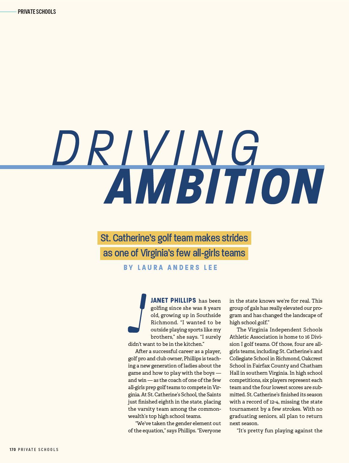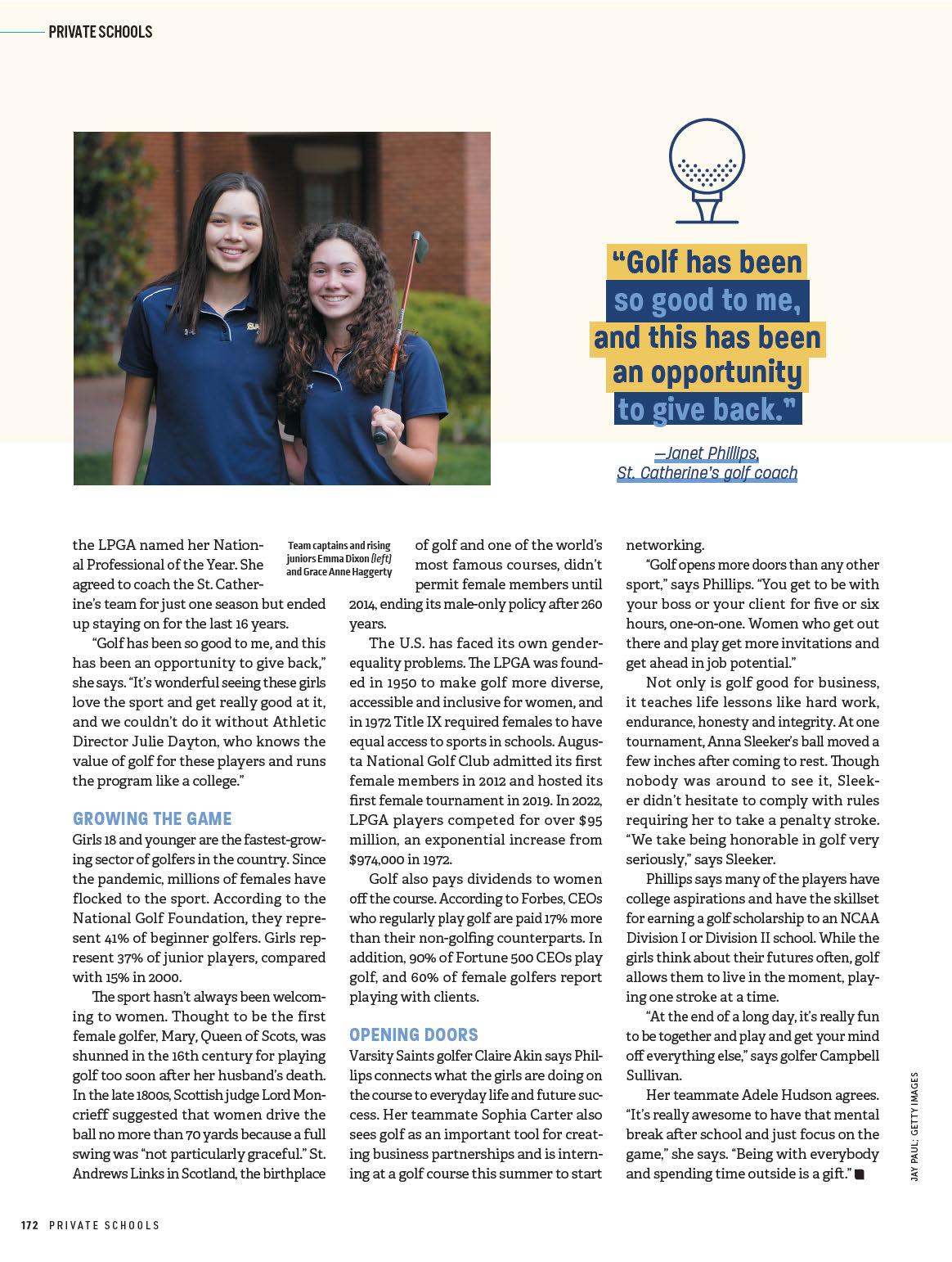 who’s actually a golf pro,” says Saints golfer Adelaide Goolsby. “And because she’s very involved with the LPGA, she understands the rules, answers our questions, helps with our golf swing and is very encouraging,” adds player Emma Dixon.