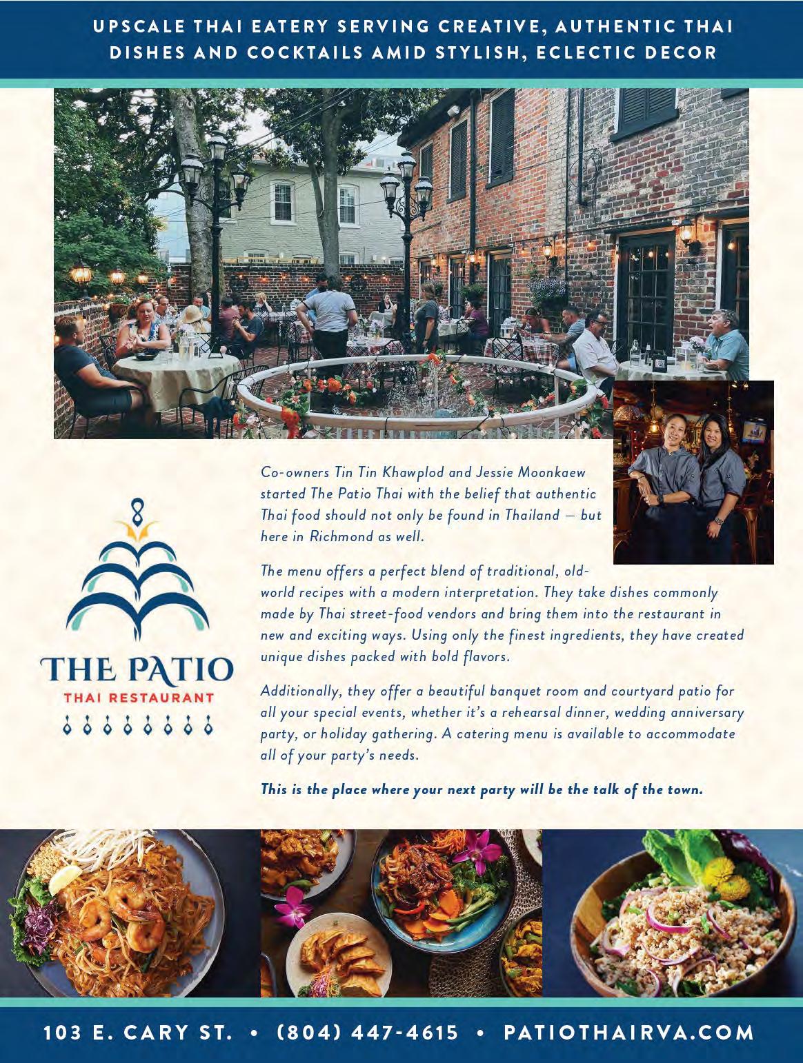 The Greek restaurant and grocery chain’s namesake, Stella Dikos, was a beloved Richmond restaurateur and cook for over five decades. Her markets are where we turn for a taste of true home cooking. First opened in 2015, the seven area locations offer top-quality takeout including fetabrined rotisserie chickens and hearty dishes created from time-honored recipes. Stella’s Grocery should also be in the rotation for family-style catering, a romantic portable picnic spread or comforting soups such as avgolemono, lamb lentil curry or Brunswick stew. eir espresso bars feature Illy cold brew, local ice cream, he y salads from the Harvest Kale to Nonna’s Chopped, spanakopita (fresh and frozen), souvlaki, rich tiramisu, and a range of sandwiches including the popular Peruvian chicken and the bu ernut squash panini.
