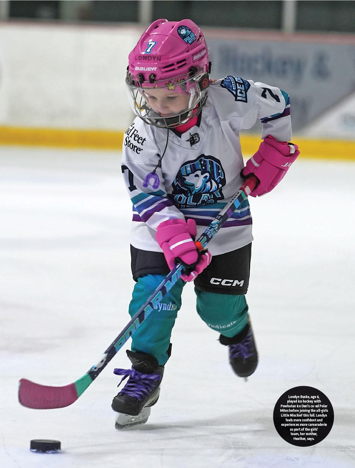 Richmond Ice Zone, SkateNation Plus and Powhatan Ice Den all o ered co-ed leagues, but Buske couldn’t find an all-girls team within two hours of Richmond. To get on the ice, Londyn joined the Powhatan Ice Den’s Polar Mites 6U team, for players 6 and under, donning a pink helmet and gloves while playing with mostly boys.
