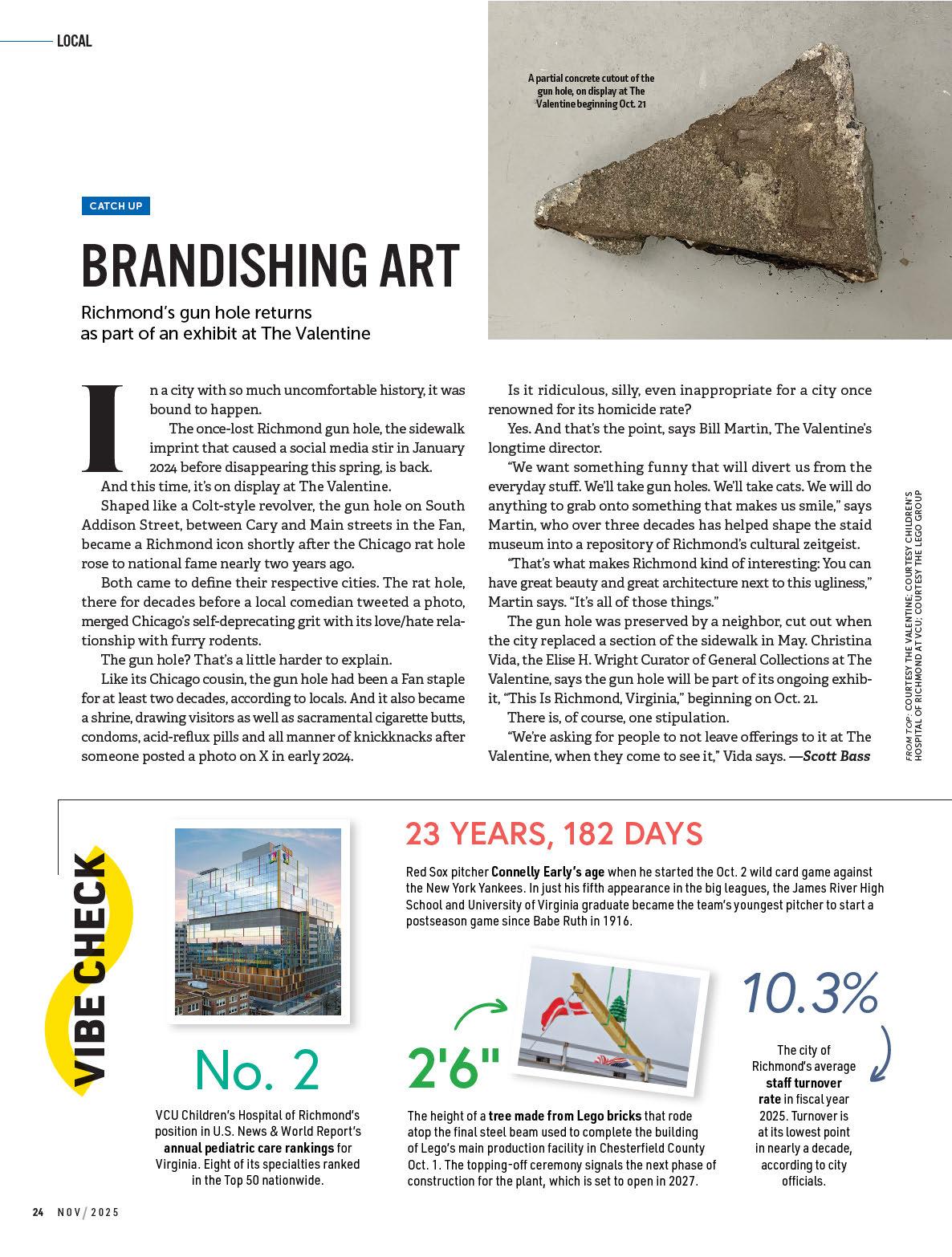 Back for its 61st year, the Visual Arts Center of Richmond’s Cra + Design show brings more than 170 artists from across the nation together to Main Street Station, Nov. 21-23. This museum-quality showcase highlights artisans who specialize in a variety of mediums, from painting and fiber arts to glass-blowing and ceramics. A endees can score handcra ed items including jewelry, home decor, clothing, sculpture and more. This year’s featured artist is Yeonsoo Kim. Based in New Hampshire, Kim is originally from Haenam, South Korea, and his signature ceramic vessels blend traditional Korean techniques with his lifelong love of drawing to create functional pieces. General admission is $15. Rise + Shine early bird shopping tickets are $65. Patron’s Pass packages, which include a preview party, early access and entry to the patrons’ lounge, start at $125. cra anddesignrva.com —NC