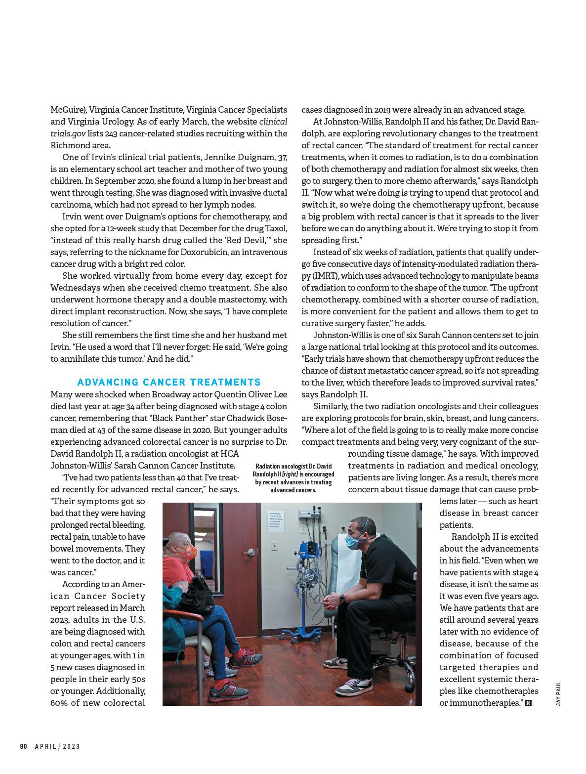 “Eighty to 85% of patients with cancer are treated in a community hospital se ing such as ours. Having trials available in someone’s backyard is absolutely necessary to give them state-of-the-art care. We don’t want to limit it to only those who can drive or fly or have the means to get to a large academic center,” says Irvin, medical director of oncology for Bon Secours Richmond and director of clinical research for the Bon Secours Cancer Institute.