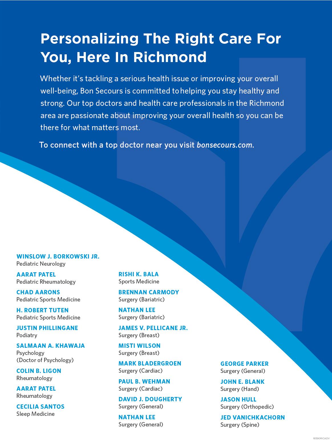As of press time, Bon Secours has 59 clinical cancer trials open. Trials are also offered at sites including Massey Cancer Center, Richmond VA Medical Center (formerly Hunter Holmes