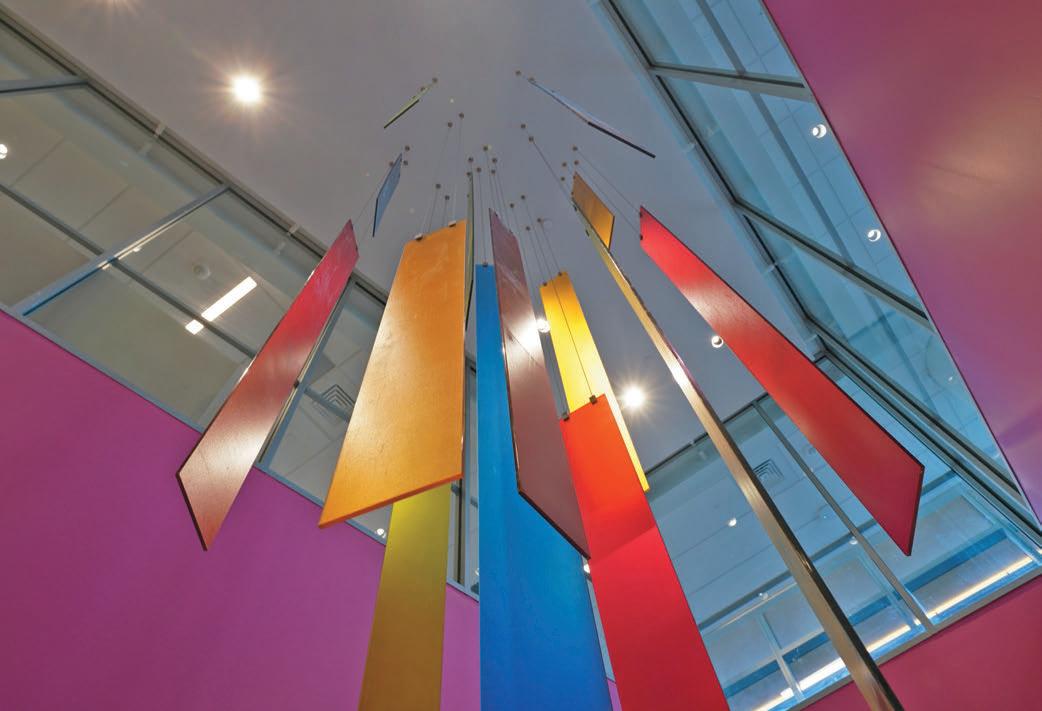 Seen from below via the cafeteria and above from the main entrance Sky Lobby, this artistic display is one of many colorful elements incorporated into the building’s design.