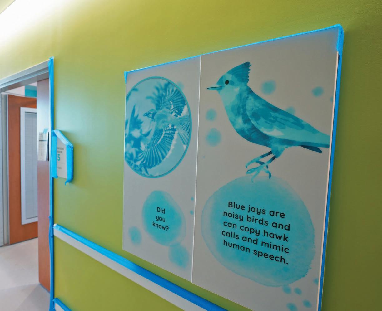 Each level of the tower incorporates a design element drawn from nature, as well as a James River-inspired animal mascot for each floor. The blue jay pictured here is on the first level and is paired with some quick facts about the bird; other mascots include a turtle, dragonfly and fox. The bold colors of the walls are different on each level so it’s easier for children to identify their room by noting that it’s on the green floor or the blue level, etc. Fun fact: The height of the tower is equivalent to 13 giraffes.