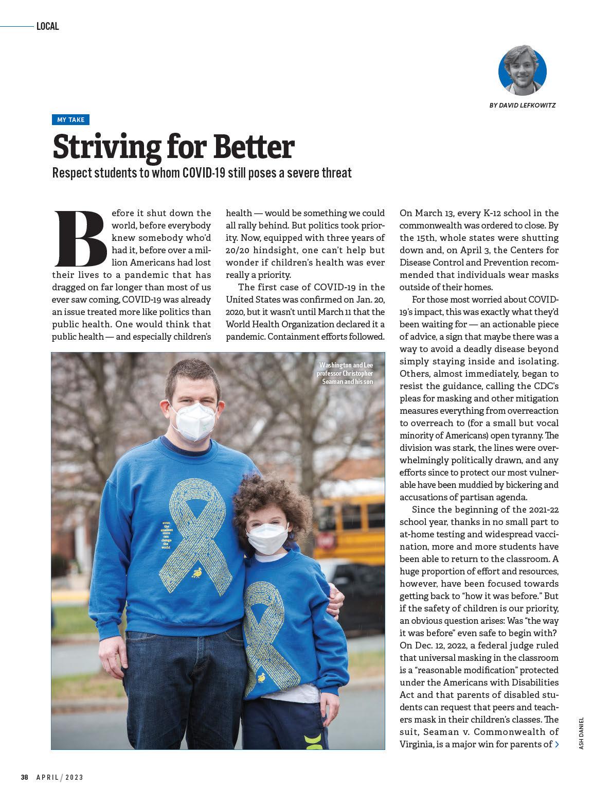 “I get that many people would like to be done with COVID,” says Christopher Seaman, a law professor at Washington and Lee University and the plainti for whom the suit was named, “but for families with a medically vulnerable child, ‘return to normalcy’ simply isn’t an option. My son has been a cancer patient for over four years, he was diagnosed with leukemia shortly a er starting kindergarten, and even though he’s