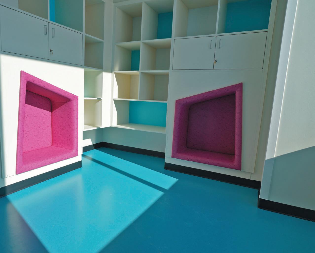 Vivid colors are used throughout the facility, creating a more inviting and comfortable space for children and their families. Amenities such as playrooms, teen spaces and family lounges are on each floor except the intensive care unit. This playroom on the 12th level is one of four to accommodate bone marrow transplant patients and epilepsy monitoring unit patients, who require a separate space due to health and safety precautions. “Part of taking care of children is taking care of their development,” says Tracy Lowerre, a pediatric nurse clinician at the Children’s Hospital of Richmond and clinical liaison for the Children’s Tower. “Some stay for way longer than what we prefer and so we need to meet all of their needs.”