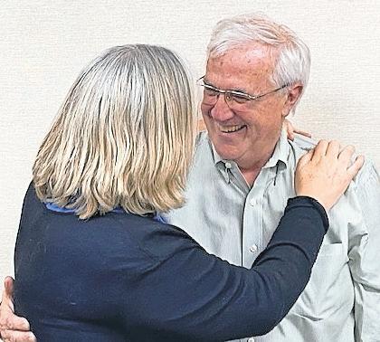 Carolyn James / Herald Wendy O’Neill gives her husband a hug as results showed he was elected the Village’s new mayor.