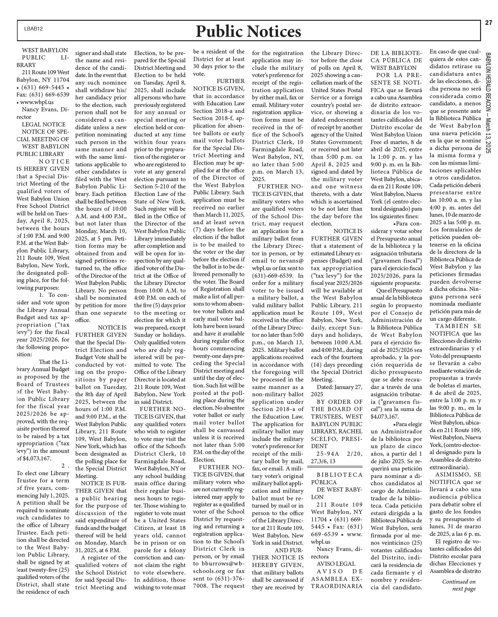 NOTICE IS FURTHER GIVEN that the Board of Trustees of the North Babylon Public Library will hold a Special Budget Hearing on March 18, 2025 at the North Babylon Public Library, 815 Deer Park Avenue, North Babylon, New York at 6:00 PM, prevailing time. Residents of the North Babylon Public Library District are invited to attend.