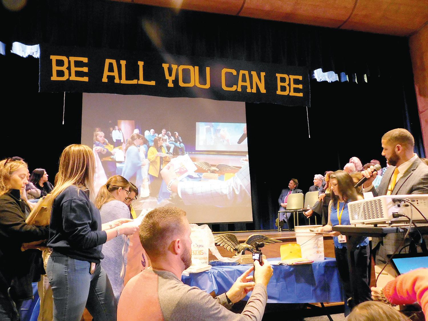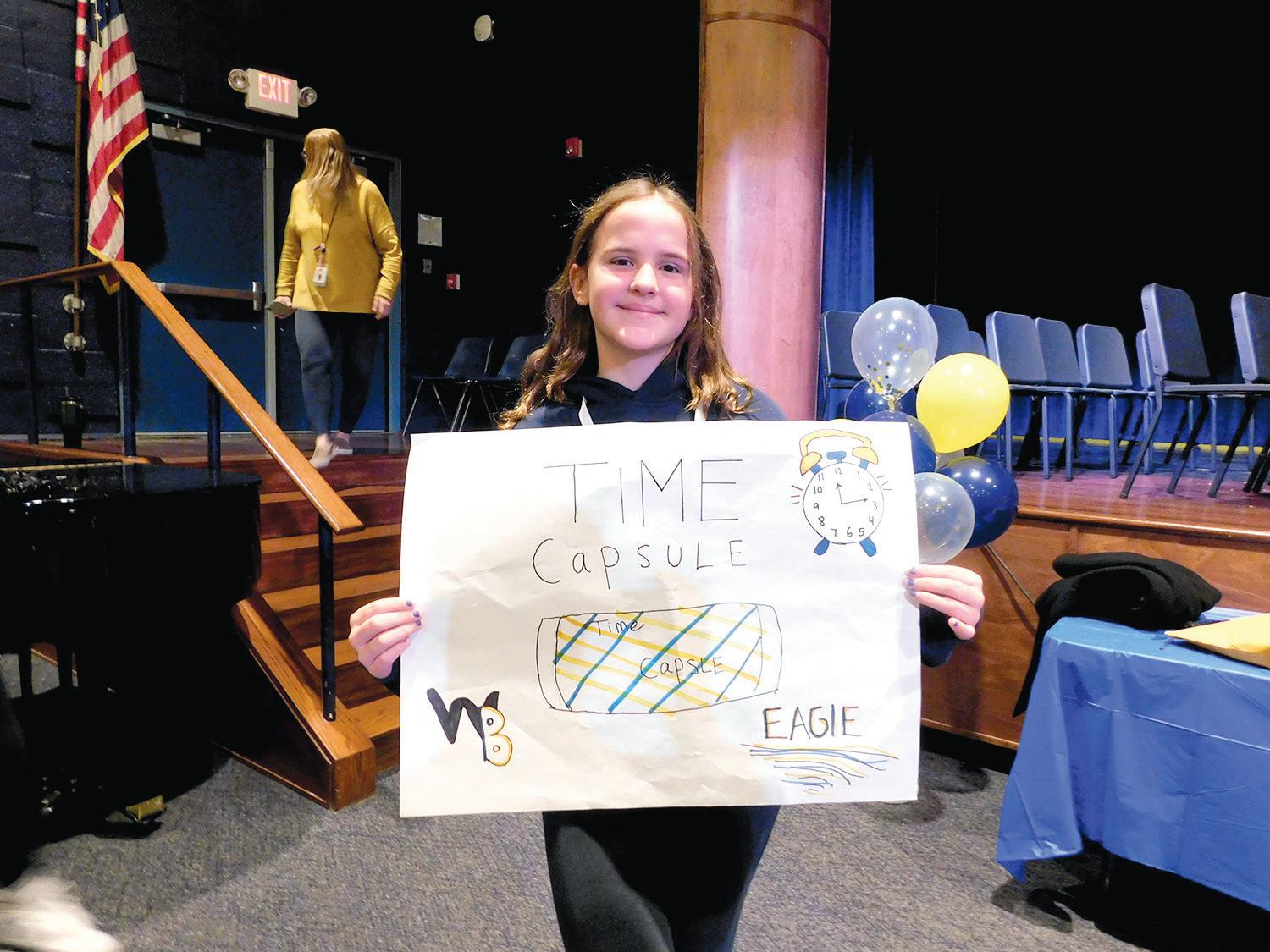 Students in grades six through eight filled Eagle Hall for the ceremony, which staff moved indoors due to cold weather after digging up the capsule earlier that morning.