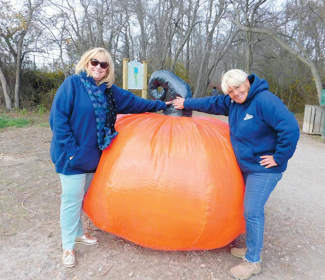 Mayor Mary Adams and Patty Duryea have a smashing good time as they pose with the giant pumpkin they brought in for the event.