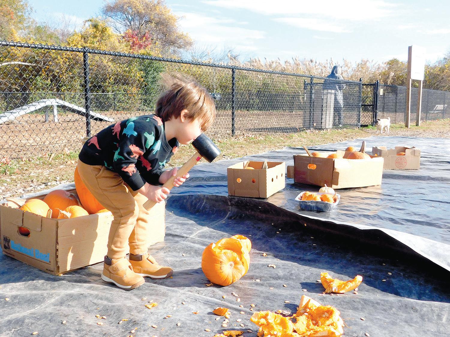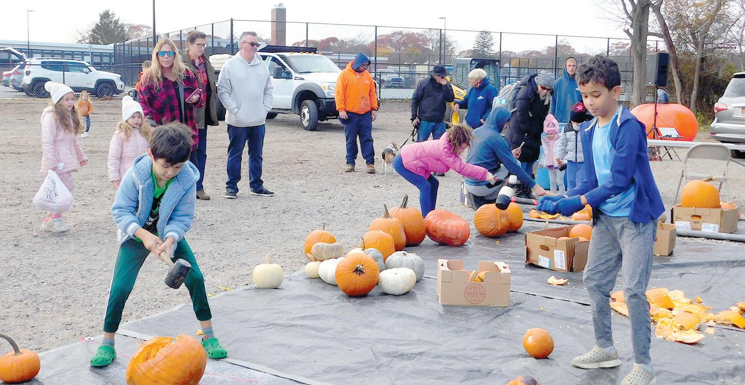 Pumpkins flew and laughter echoed across Southards Park as families gathered for Babylon Village’s second annual Pumpkin Smash on Friday, Nov. 15. With small mallets in hand and strollers piled high with leftover jack-o’-lanterns, children and their parents lined up to take turns smashing gourds on a long tarp spread across the field.
