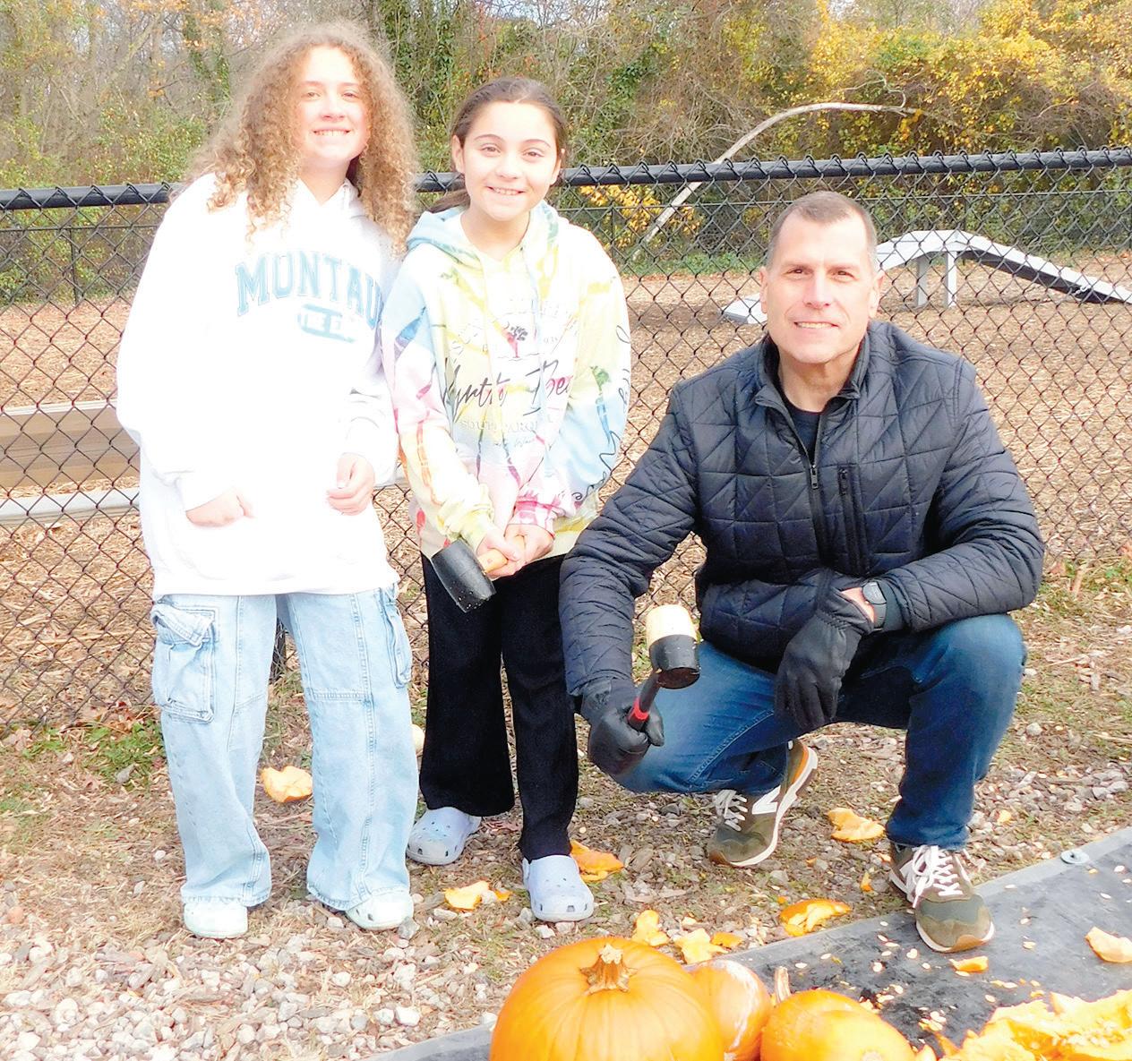 Newly appointed trustee Jeffrey Szabo joining Charlotte Cohen and Isabel Focarile to smash some pumpkins for Southards Park wildlife.
