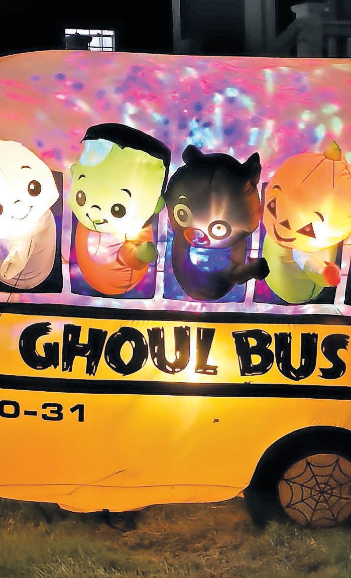 Above, the homeowner on Judith Drive transformed the property into a haunted carnival. Right, a bright yellow “Ghoul Bus” inflatable was parked on a front lawn outside of a house on Natta Boulevard.
