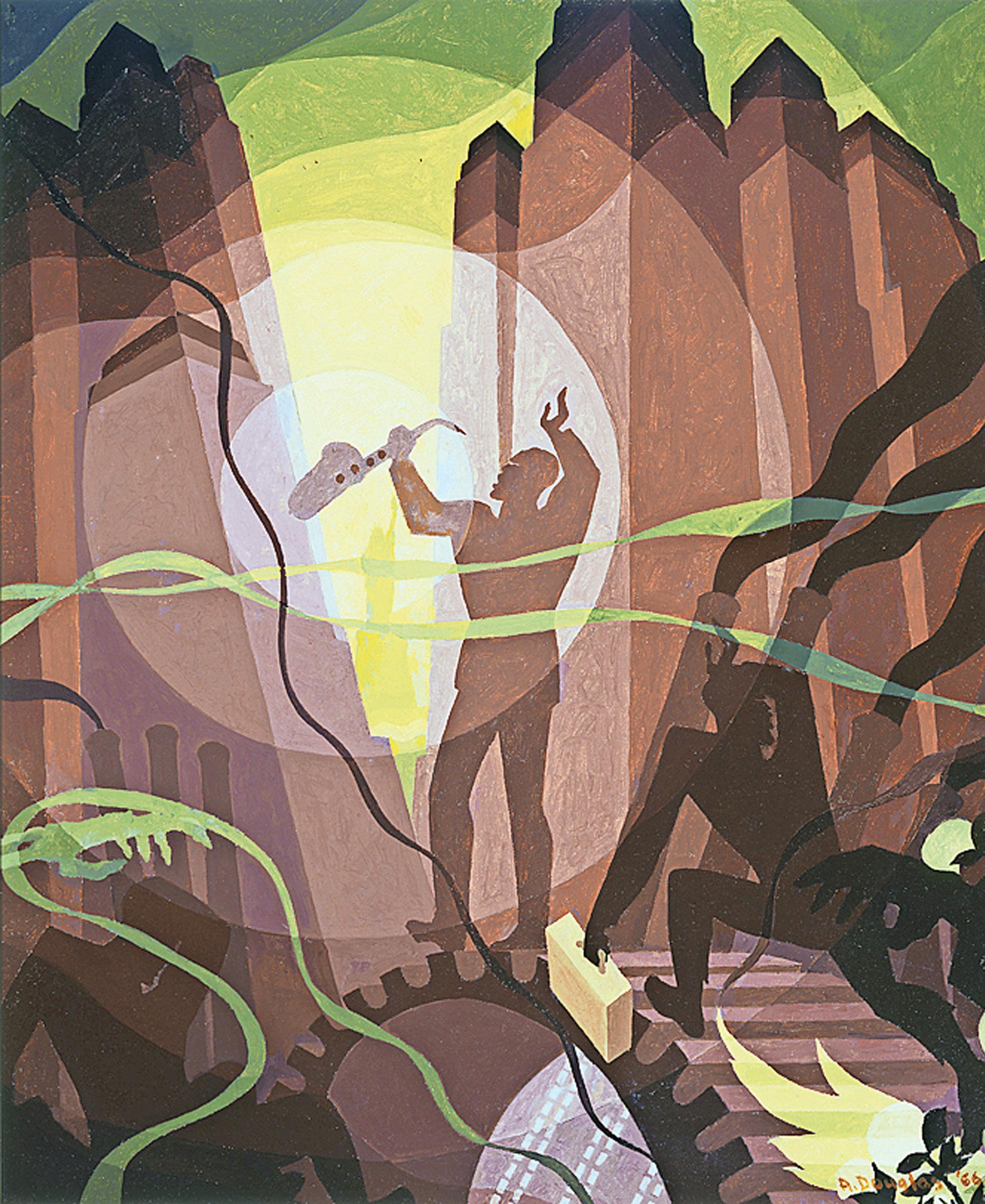“the Song of the towers,” a 1934 painting by artist aaron douglas, illustrates the intersections of african culture and contemporary aspects of african american life.