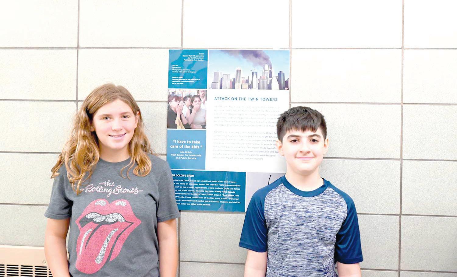 Copiague Middle School seventh graders Gabriella Ruggerio and Azzo Manfredonia in front of one of the posters created for the 9/11 museum gallery walk.