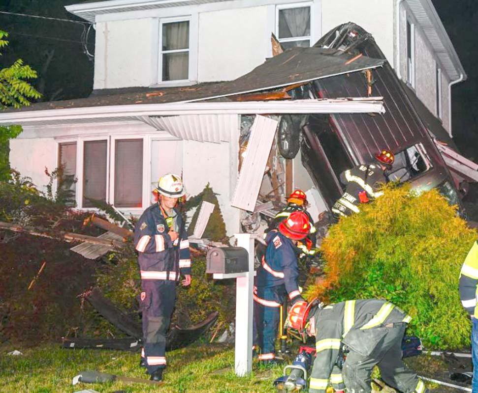 Police and West Babylon Fire Department volunteers rushed to the scene of a motor vehicle accident in West Babylon during the early-morning hours of Sun., July 28. When they arrived, they discovered that a car struck a home at 128 Great East Neck Road, south of Crocus Court, stopping just ten feet away from a living room where two residents of the home were seated.