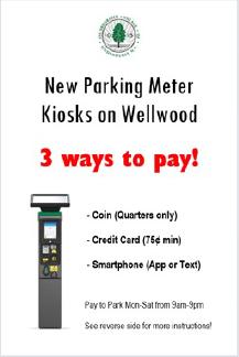 parking in a numbered space must use a new parking kiosk, or their smartphones (pay-by-app or pay-by-text), to pay for parking. Customers parking in non-numbered spaces with an old-style parking meter should continue to use the old meter as they do today. Also, specially marked 15-minute free “in-and-out” spaces will remain on both North and South Wellwood! Parking times and fees remain the same as before -all meters are in effect Monday through Saturday from 9AM to 9PM; $0.25 per hour/3-hour maximum.