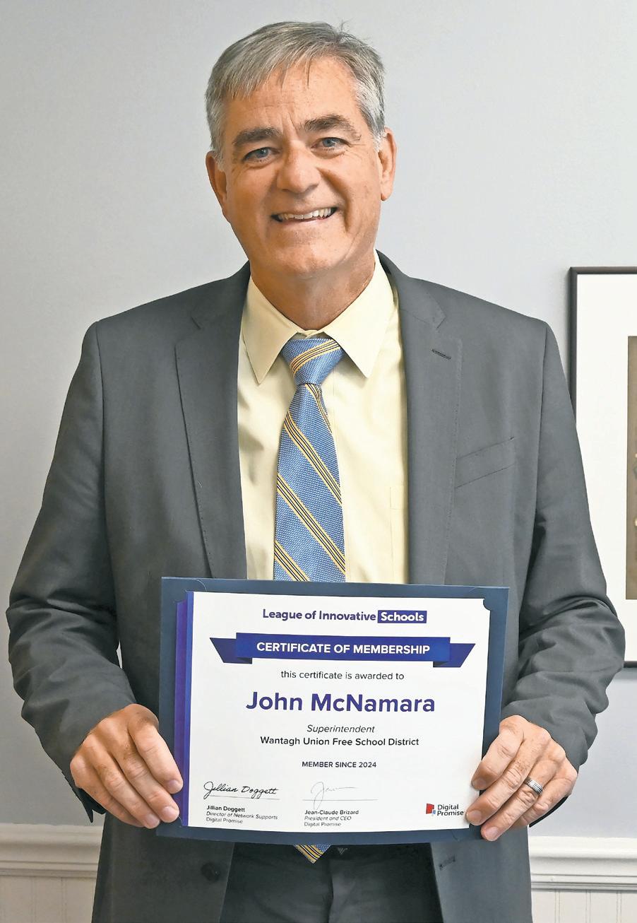 Wantagh School district Superintendent John mcnamara with a Certificate of inclusion for the League of innovative Schools, a national network of school districts that connects and supports the most forward-thinking leaders in education.