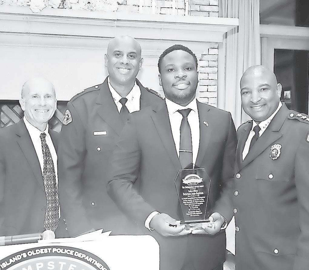 Police officer Peterson Jean-Baptiste held the Distinguished Service Award presented by Ret. Lt. Frank McNamee, left, Assistant Police Chief Derek Warner and Hempstead Police Chief Richard Holland, Right.