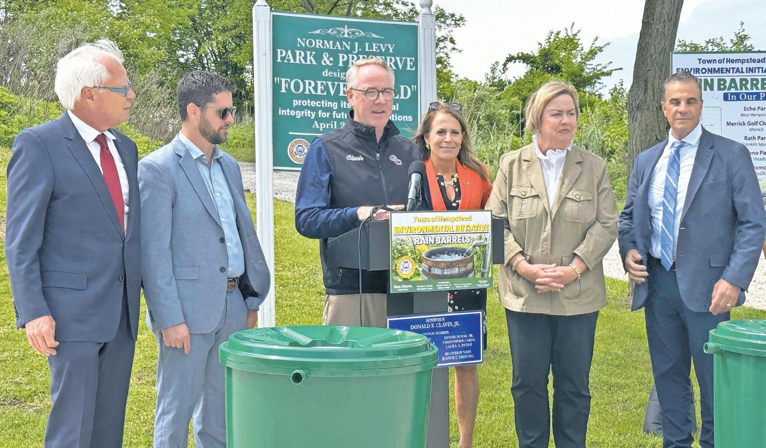 The Town of Hempstead is taking a progressive approach to combatting water conservation issues on Long Island. Supervisor Don Clavin, joined by colleagues in government, as well as Frank Piccininni and Marshall Brown of the Long Island Conservancy, announced its plan to launch a new rain barrel program last week at the Norman J. Levy Park and Preserve in Merrick.